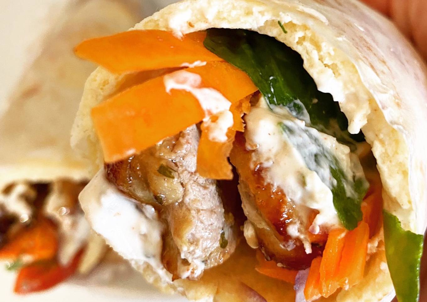 - Para montarlo, a la tortilla se le agrega el tomate, la lechuga, queso feta, el pollo, la zanahoria, la cebolla y se cubre con el marinado reservado.